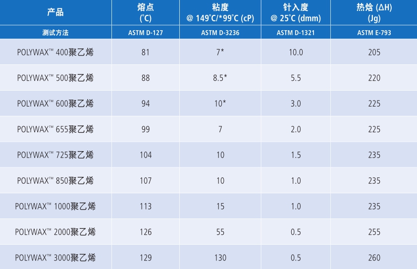 400聚乙烯)到最高 0.98 g/CC (POLYWaX? 3000聚乙烯)。在应用中,POLYWaX?聚乙烯表现出精确的