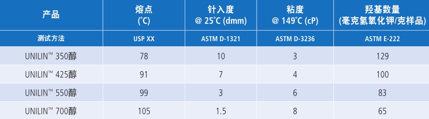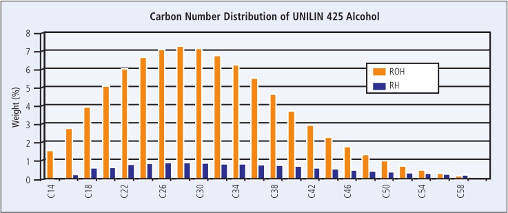 相比,UNILIN?醇类产品分子量较大,结晶性较高,纯度较高,伯醇含量约为80%。